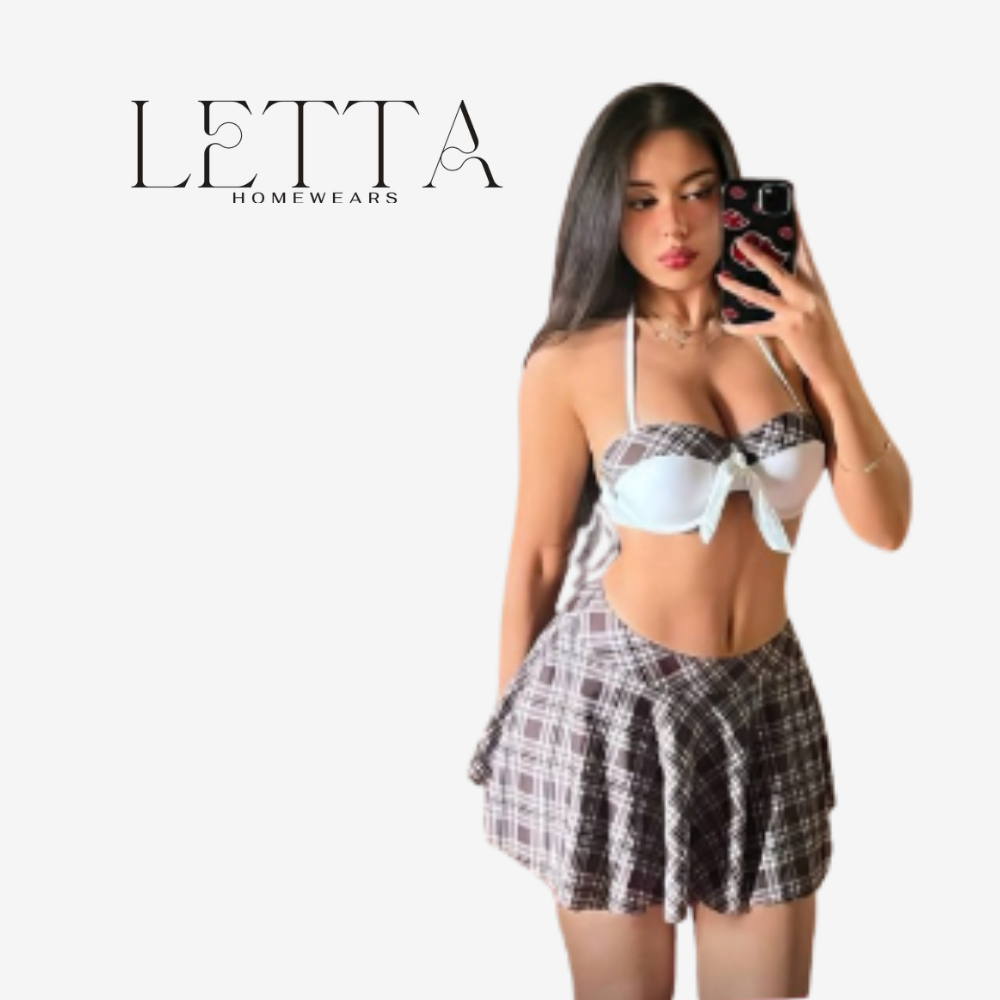 Elevate your homewear collection with the Letta Homewears Plaid Lingerie Set. This 2-piece cosplay ensemble features a soft, tie-front halter top paired with a flirty pleated skirt. Crafted from our signature “Zebda” (Butter) fabric, this set offers a silky-smooth feel and exceptional stretch, making it the perfect blend of comfort and style.